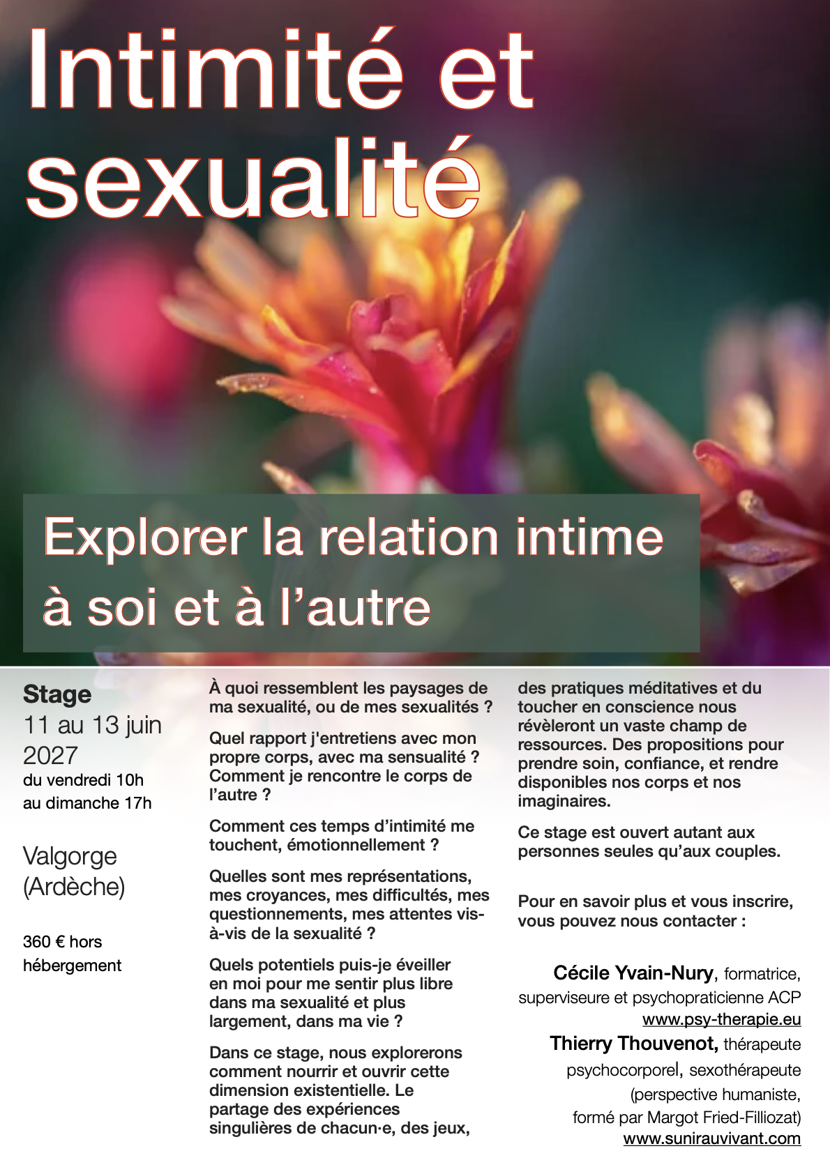 - Sexothérapie consciente : « Intimité et sexualité », du 11 au 13 juin 2027, à Valgorge (Ardèche) – Stage co-animé avec Cécile Yvain-Nury, psychopraticienne.